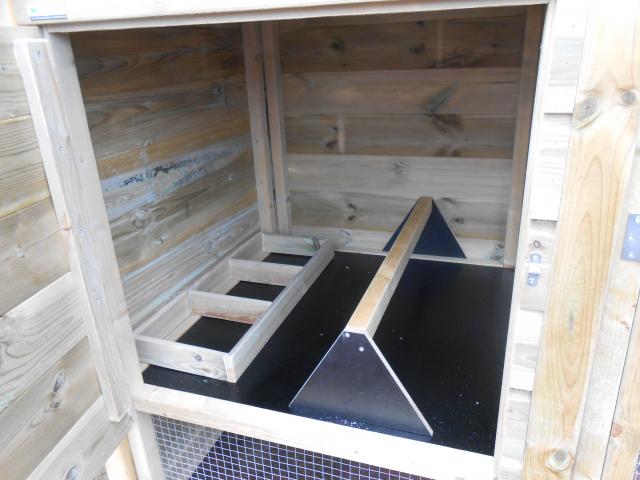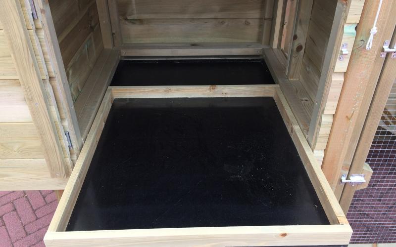 - Een uitschuifbare mestlade om het schoonmaken van het nachthok nog makkelijker te maken.