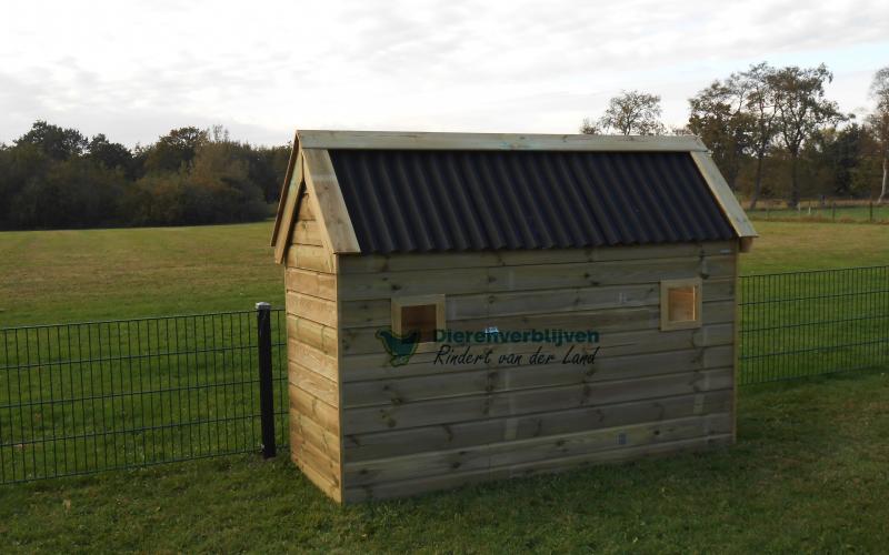 - Maatvoering van het verblijf kan aangepast worden naar de gewenste afmetingen. Ook hebben we een aantal standaard mogelijkheden. Hierbij kun je denken aan diepte: 100 cm, 150 cm en 200 cm. Lengte: 200 cm, 240 cm, 300 cm, 400 cm en 600 cm.