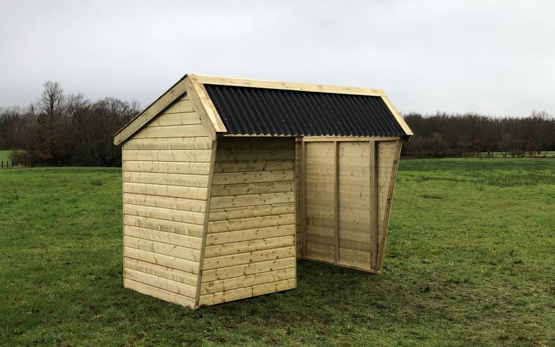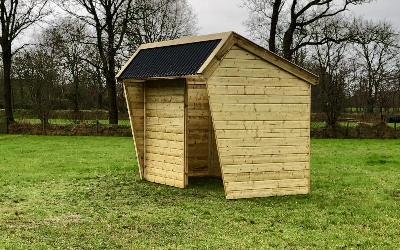 Hier afgebeeld: Schuilstal, afmetingen circa 3,00 x 2,00 x 2,60 meter