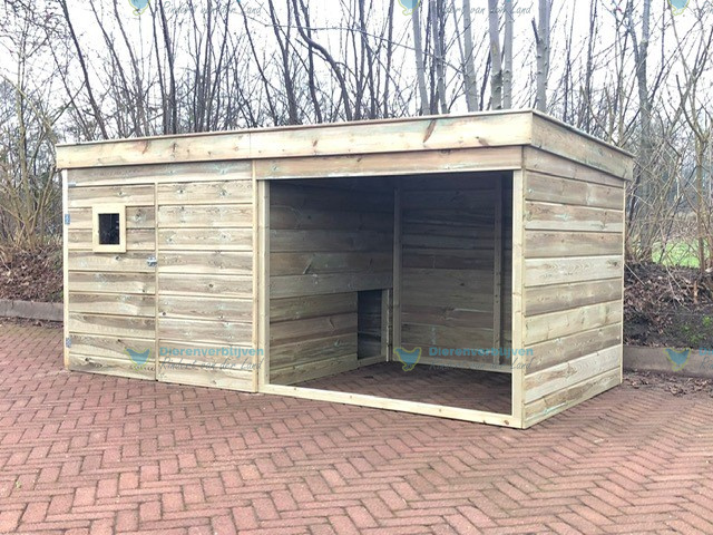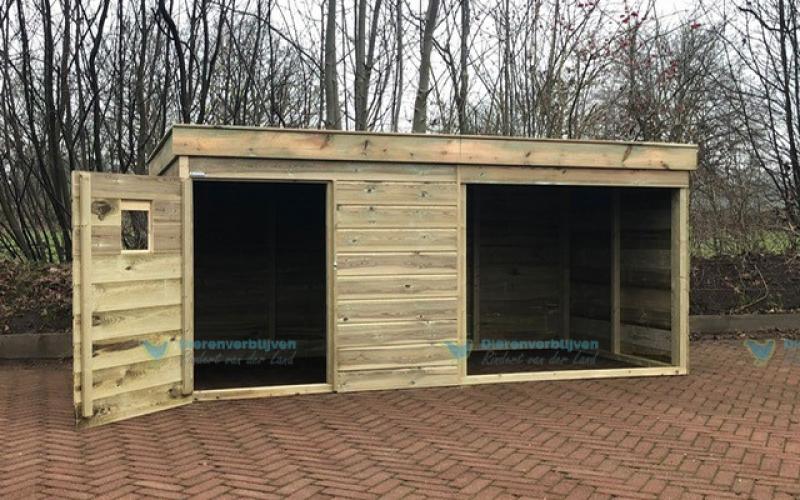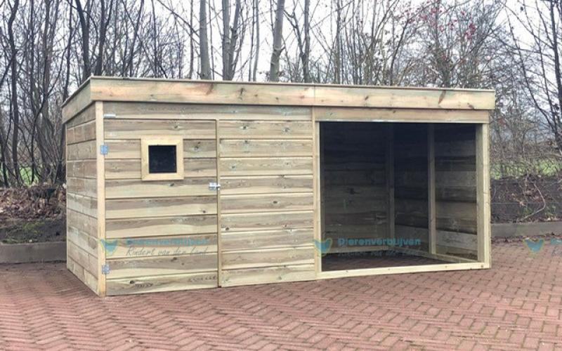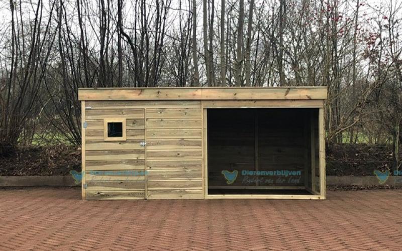 Hier afgebeeld: Schuilstal met nachthok afmetingen circa 3,00 x 1,50 x 1,40 meter